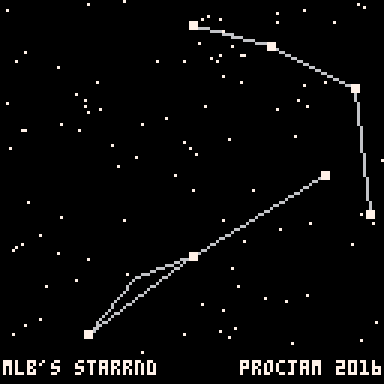 Procedural constellation generation, a spin-off of my #ProcJam 2016 entry WIZRND -- I've just tweaked the settings a bit and released this as a standalone curiosity.